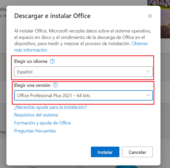 En el siguiente cuadro elige el idioma y la versión de office que quieres instalar (32 bits o 64 bits), esto depende del pc, si no sabes cual elegir, elige la opción Predeterminada y presiona instalar.