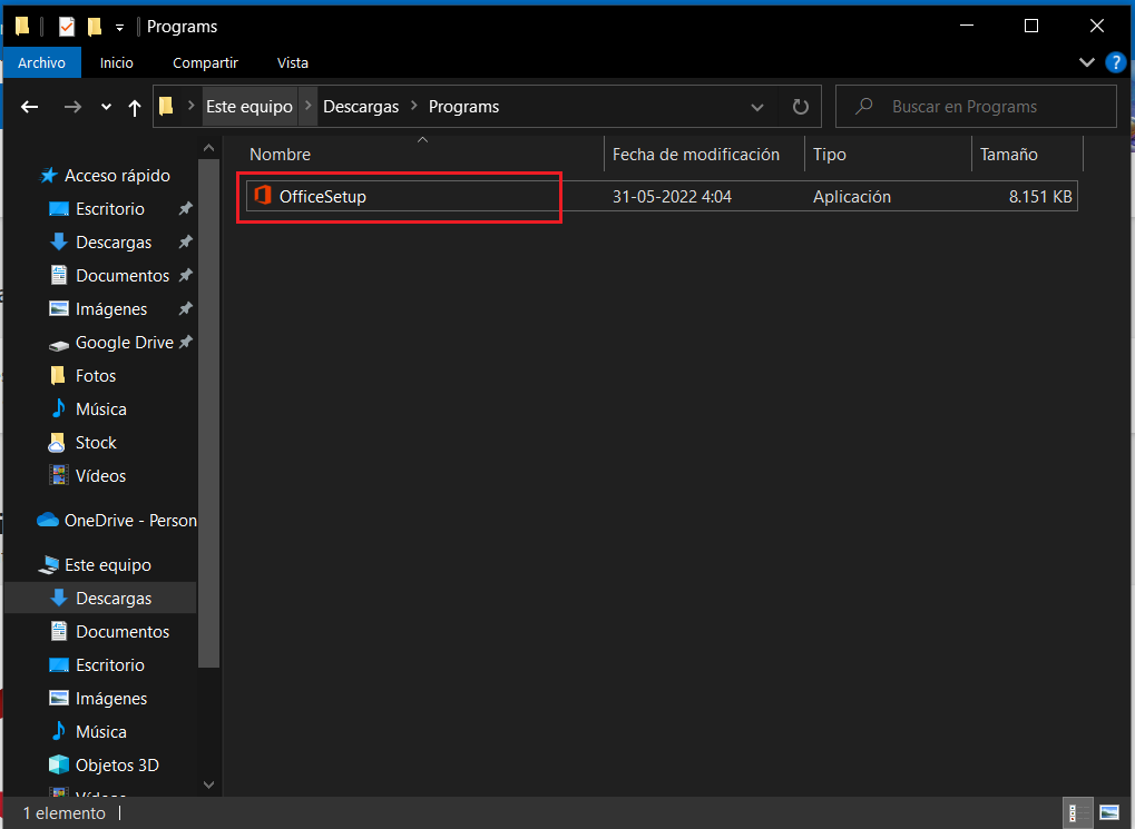 Una vez presiones instalar se descargará el archivo con nombre “OfficeSetup”, ejecuta este archivo para que comience la instalación.