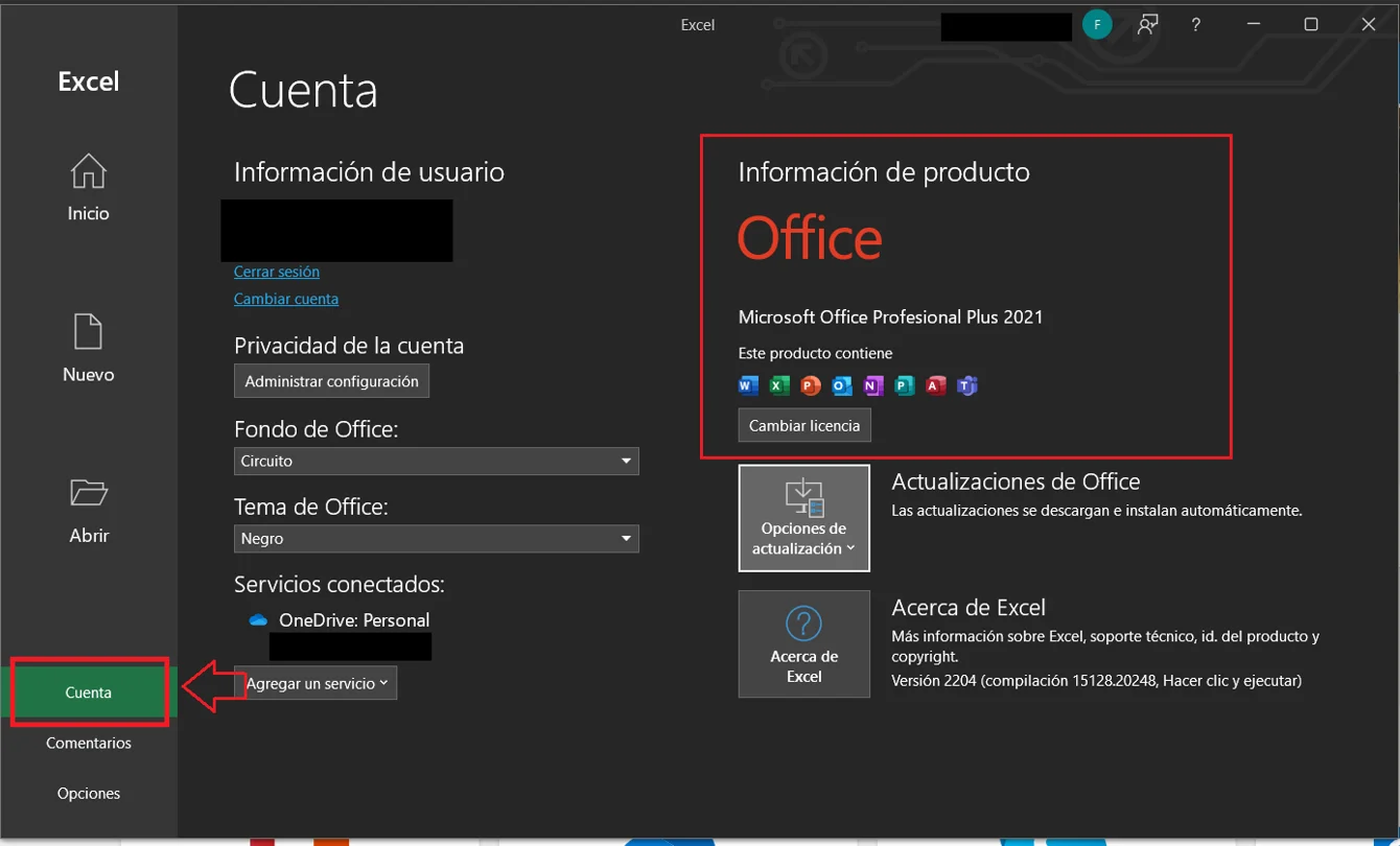 En la opción cuenta te saldrá el estado de Office Professional Plus, en caso de que salga sin licencia aún, cierra la aplicación y vuelve a ingresar a cuenta y debería estar activado.