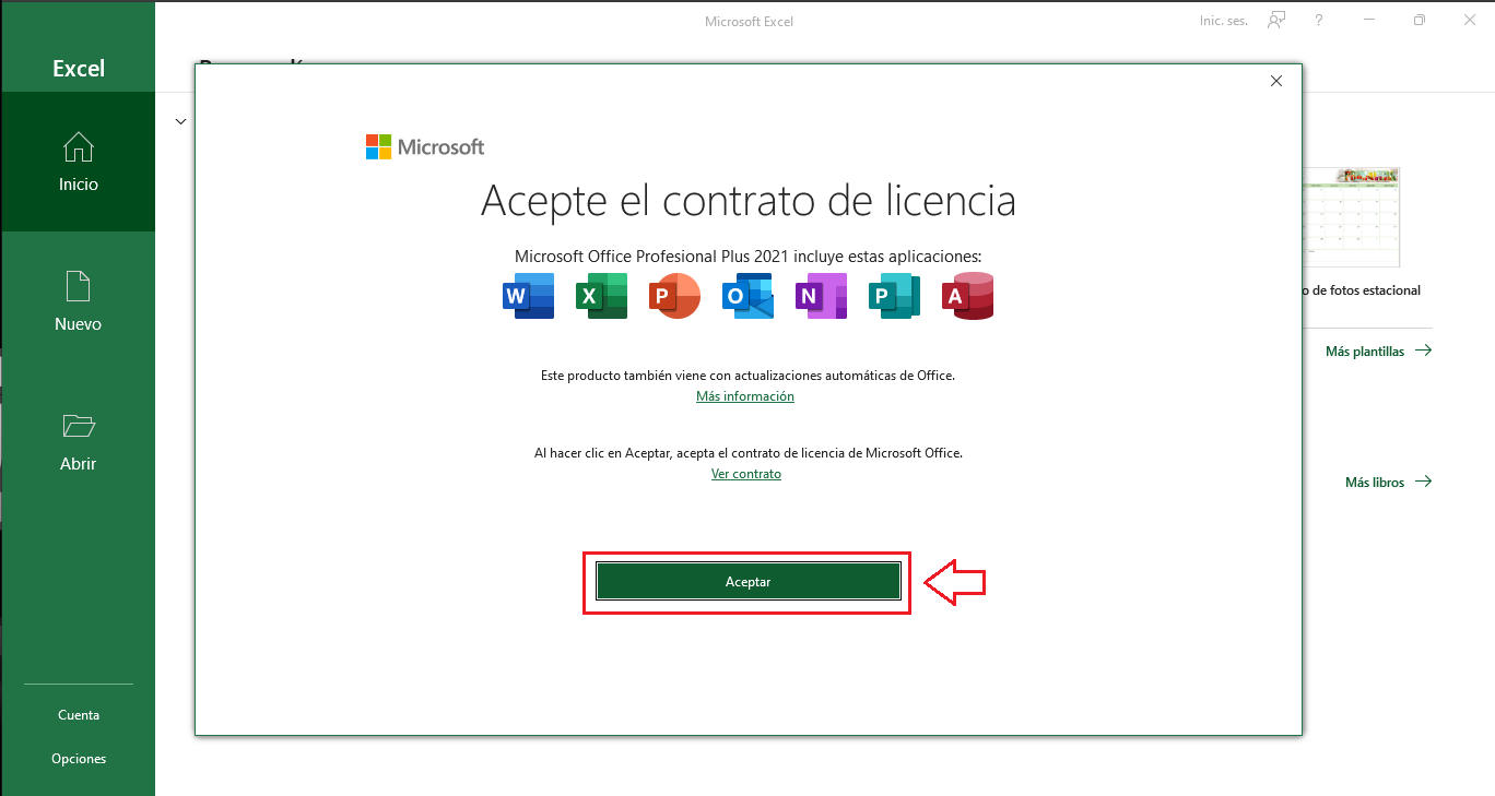 Una vez instalado busca y abre Excel, PowerPoint o Word, en algunos casos al abrir la aplicación te muestra la imagen de Office 2019, esto es normal, se muestra así por temas del software, acepta las condiciones y te pedirá la clave de activación.