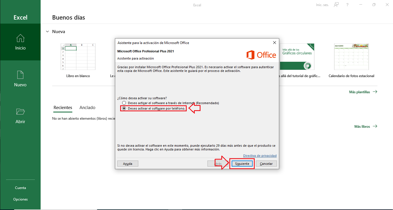 En el siguiente cuadro presiona “Deseo activar el software por teléfono”.