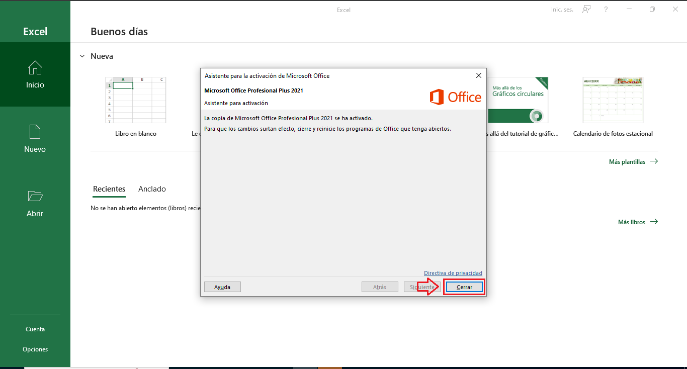 Cuando presiones activar se cerrará la ventana, para corroborar que la activación fue correcta ingresa a la opción cuenta en el menú del lado izquierdo.