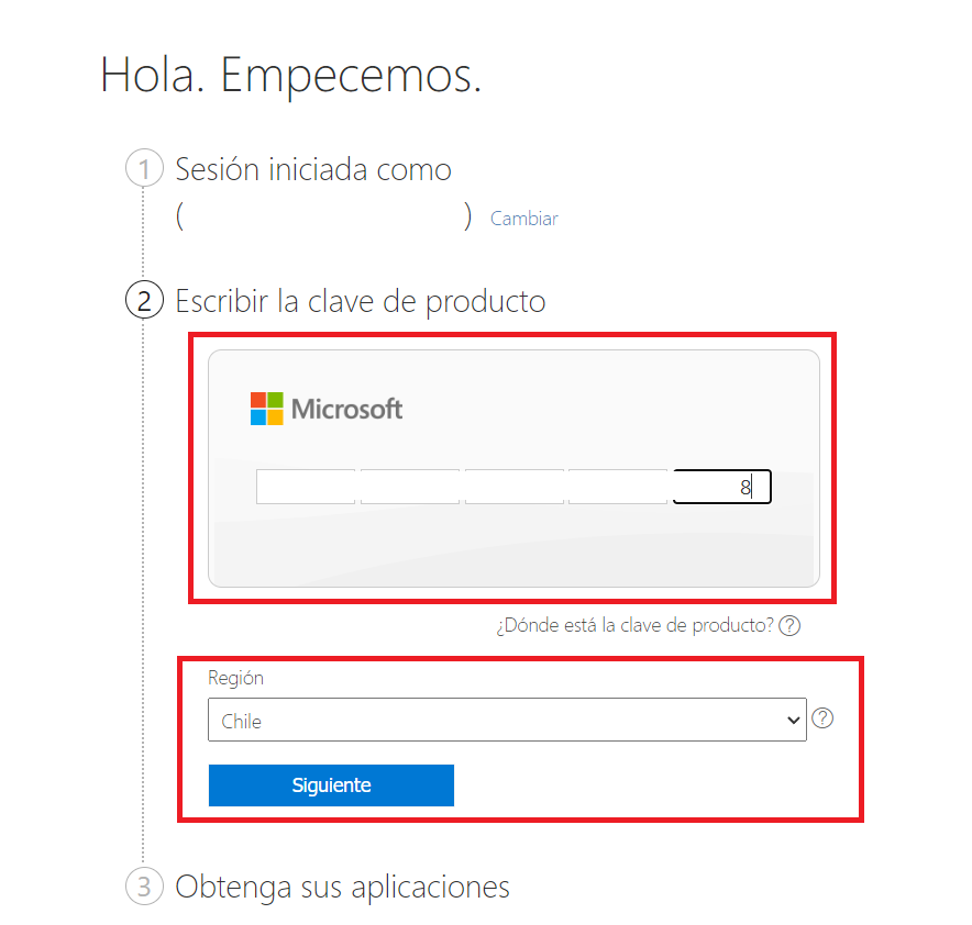 Una vez que hayas iniciado sesión, ingresa el código de 25 dígitos que se envió a tu correo electrónico, elige la región y presiona siguiente