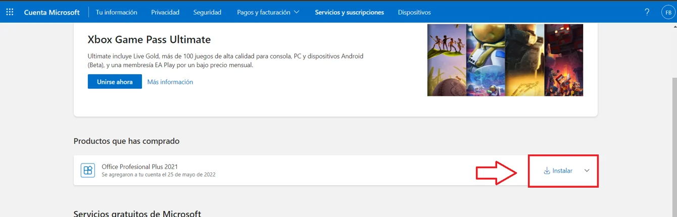 Una vez confirmado el código te llevara a la página de configuración de Microsoft, donde te dará la opción de instalar.