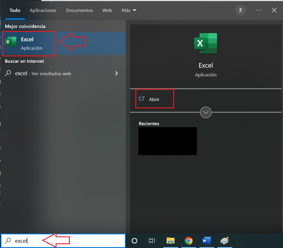 Ahora que office ya esta instalado, en el buscador de la barra escribe Excel, Word o PowerPoint y presionar abrir.