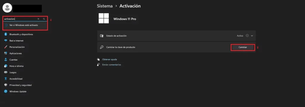 A continuación, haz clic en Activación en el menú de la izquierda y selecciona Cambiar la clave de producto.