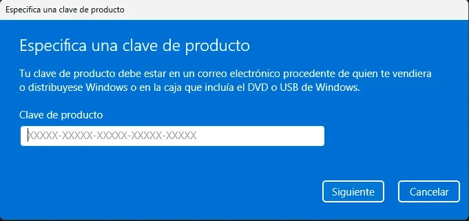 Finalmente, en el cuadro que aparece, pega tu clave de Windows 11 y haz clic en Siguiente.