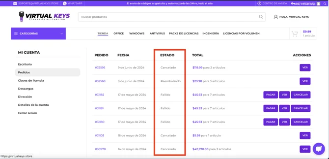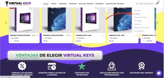 Debes ir a Mi Cuenta>Pedidos o ingresar a esta URL: https://virtualkeys.store/mi-cuenta/pedidos/